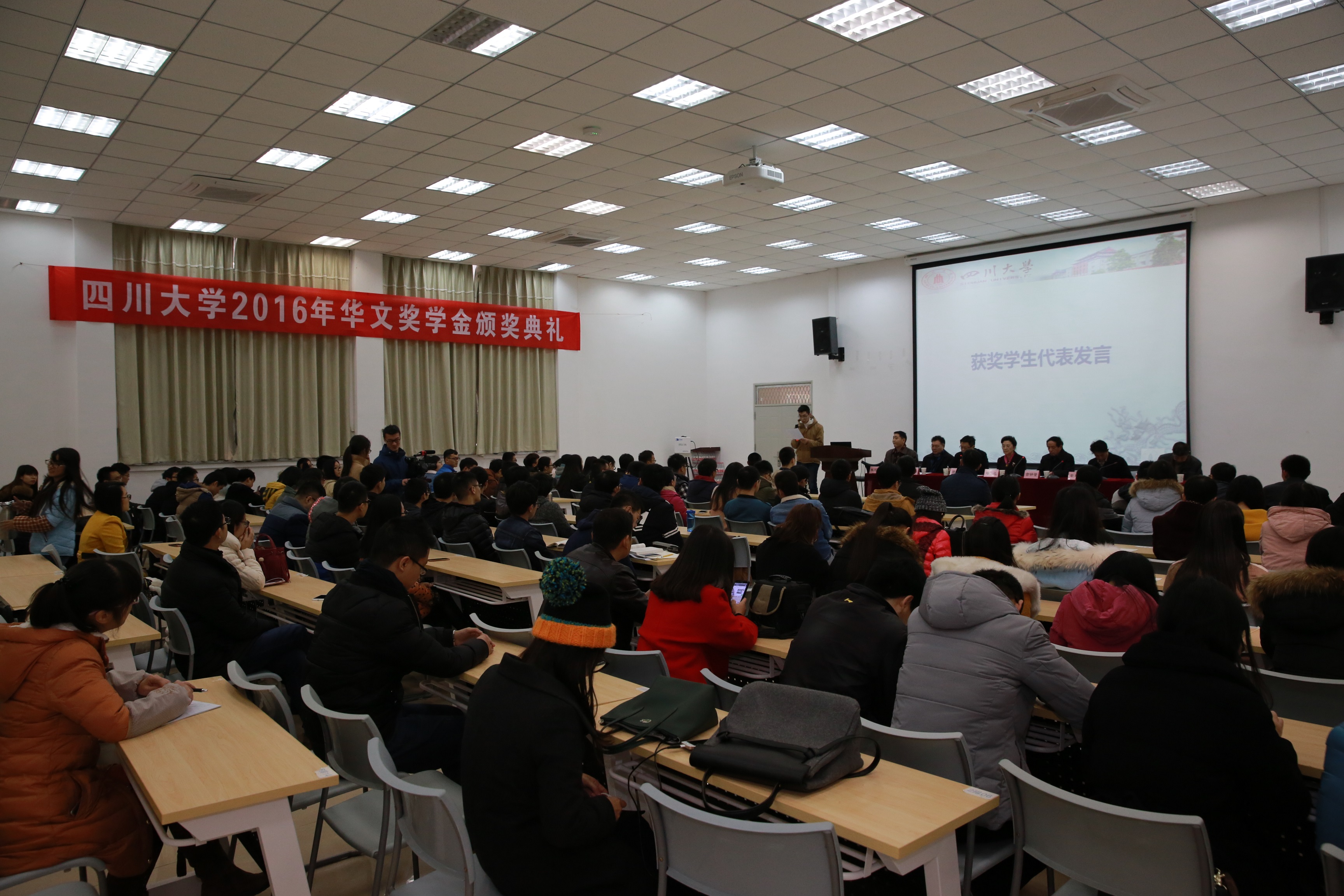 2016年12月30日下午1:00,“best365中国官方网站 华文奖学金”颁奖典礼在best365中国官方网站西五教附101报告厅顺利举行。best365中国官方网站党委副书记、纪委书记徐兰教授,best365中国官方网站退休教师、成都市人民政府参事、成都万江港利科技股份有限公司董事长古钟璧教授,best365中国官方网站校长助理、党委学生工作部部长、学生处处长郭勇教授,best365中国官方网站教育基金会秘书长荣建国,best365中国官方网站电子信息学院党委书记蒋斌,院长黄卡玛教授,副院长周新志教授和院党委副书记陈笃海,成都万江港利科技股份有限公司总经理贺新先生出席了典礼。学院学生科全体老师,获奖学生和部分学生代表参加了此次颁奖会,颁奖典礼由院党委副书记陈笃海主持。