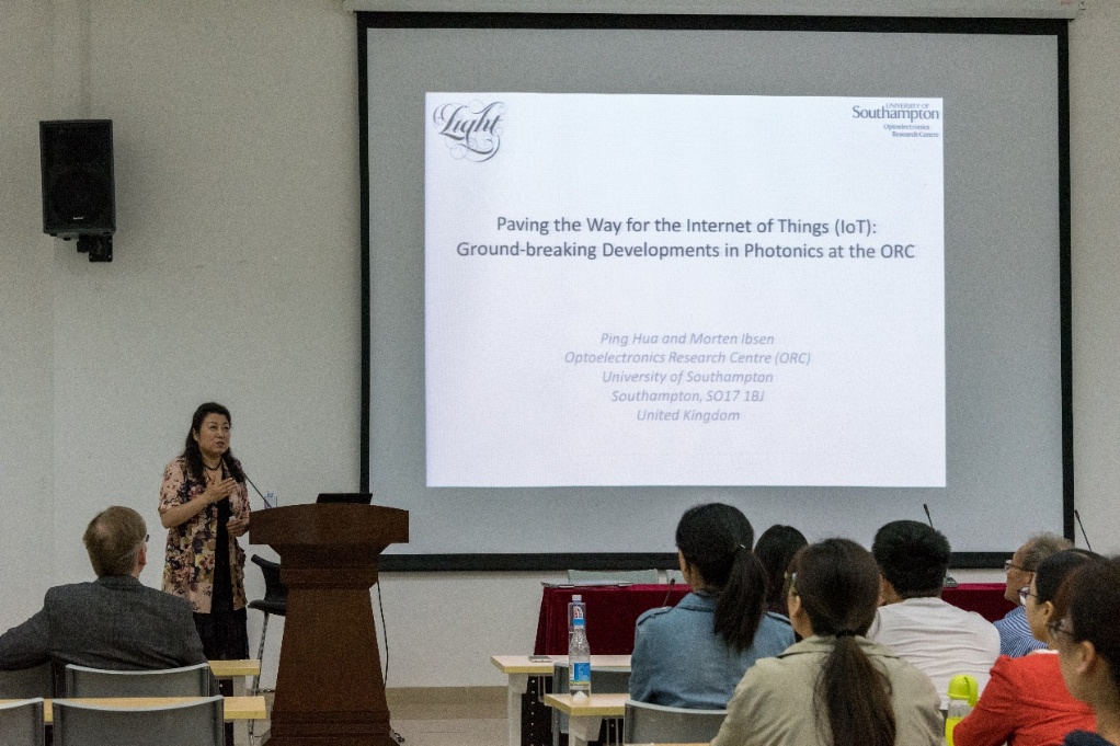 2017年5月2日,受校长谢和平院士邀请,英国南安普顿大学光电子研究中心 Morten Ibsen 教授和华萍高级研究员一行来我院参观访问交流,并做精彩学术报告。中国工程院院士周寿桓作为嘉宾出席了报告会,学校相关专业师生积极参与了讲座及学术讨论。电子信息学院副院长冯国英教授主持了报告会。
