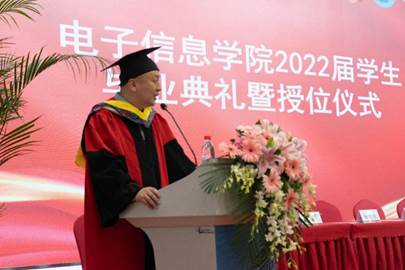 党委书记邰明松首先代表学院向2022届287名研究生和316名本科生表达了最热烈的祝贺和最美好的祝愿。邰书记深情的回顾了同学们成长和进步的的点点滴滴, 在离别之际,邰书记寄语同学们要牢记电子信息学院的优良传统,敏行讷言,敢为人先,脚踏实地,志存高远;要拥有坚强的意志和乐观向上的心态,迎接生活中的各种挑战;要有家国情怀、使命担当,要把自己的人生理想融入到国家和民族的事业中,以天下为己任,让青春在为祖国、为人民、为人类的奉献中绽放光彩!学院将时刻关注着同学们的发展,始终作为同学们打拼的坚强后盾,祝愿同学们前程似锦,捷报频传!