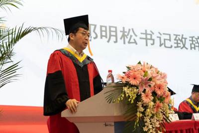 教师代表郭庆功教授向同学们表示热烈的祝贺,他告诫同学们“帽子”固然重要,但本领和素养才是终身的法宝。郭庆功教授希望同学们要学会感恩,要有责任担当;要提高阅读和思考的能力,要学会“低头拉车、抬头看路”。他期望同学们在未来的岁月里心中有理想,脚下有方向,眼中有光芒,肩上有担当。