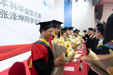 本科生张泽坤同学在发言中表达了同学们对离开母校的不舍,他表示同学们将铭记川大的教导,认真践行川大校训“海纳百川 有容乃大”,去聆听、去思考,实学实干,脚踏实地,在真刀真枪的实干中成就一番事业,在攀登人生高峰中不断追求卓越。