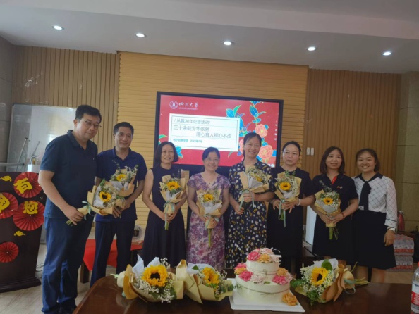 学院党委书记邰明松同志为荣休教师和从教30年教师颁发纪念章及纪念品并与老师们合影留念,学院青年教师代表向荣休教师及从教30年教师献花。