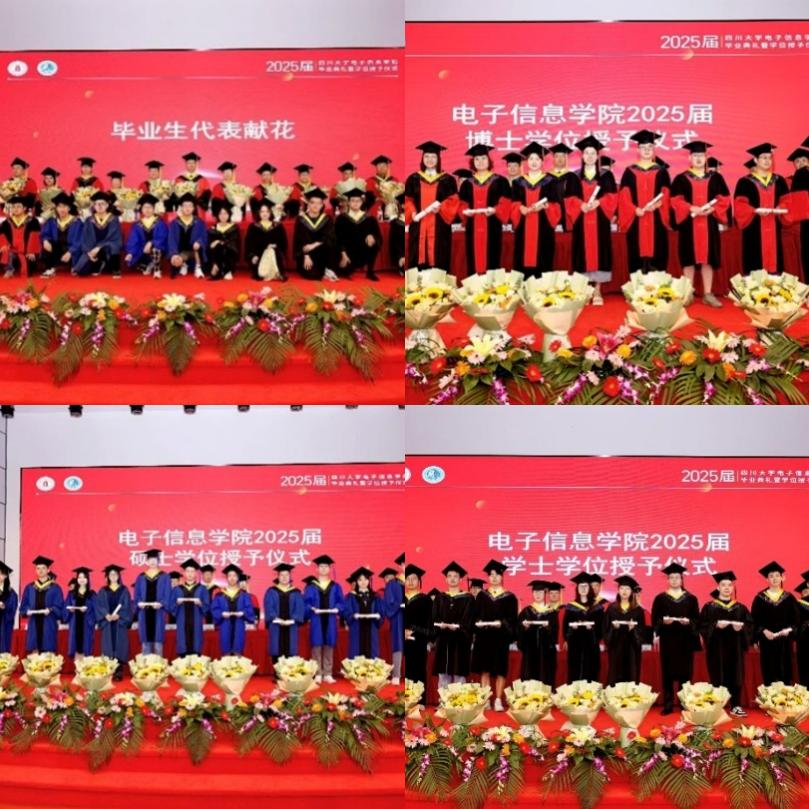 6月11日上午9点,best365中国官方网站电子信息学院2025届学生毕业典礼暨学位授予仪式在望江校区东三教演播厅隆重举行。学院党委书记彭舰,院长杨阳,党委副书记廖勇明,副院长雷印杰、卿粼波,教师代表曹益平教授、滕奇志教授、杨鑫松教授、汪莎研究员、朱铧丞教授、卢萍副教授、钟哲强副研究员,以及2025届毕业生及毕业生家长代表参加此次典礼。雷印杰副院长主持典礼仪式。