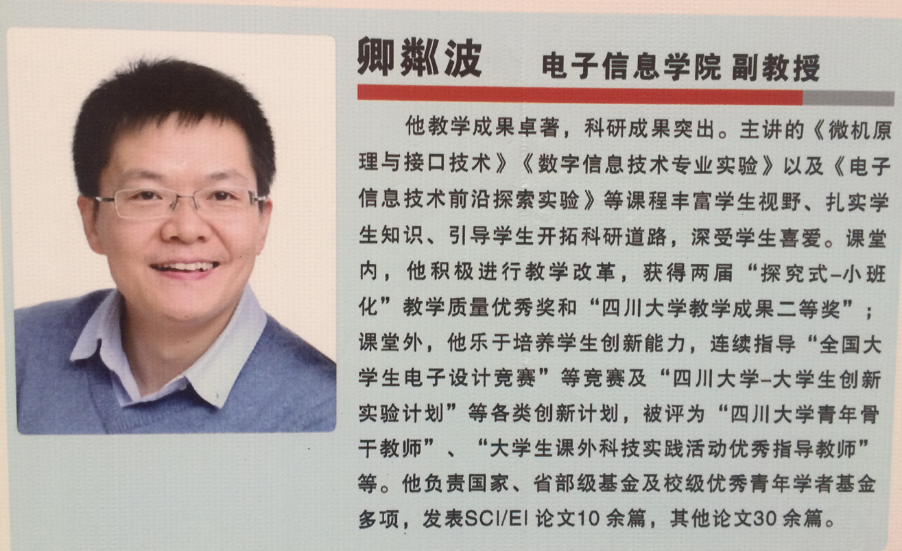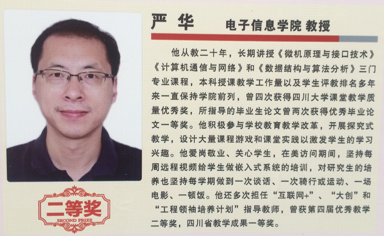 会上,教育部高教司吴岩司长、范海林副司长、王启明副司长及我校王建国书记和李言荣校长为第三届五粮春青年教师优秀教学奖、第三届“星火校友奖教金”、第四届卓越教学奖的获奖教师以及本科教学奖获奖单位和个人代表颁奖。我院刘长军老师获得 “卓越教学奖”, 严华老师获得“星火校友奖教金”, 卿粼波老师获得“五粮春青年教师优秀教学奖”。本科教学先进个人中,电子信息学院严斌宇、周昕、张启灿、陈笃海、赵成萍、邓国亮等32人次分别获得“探究式—小班化”教学质量优秀奖、课堂教学质量优秀奖、文化素质公选课最受欢迎教师奖、大学生课外科技实践活动优秀指导教师、全英语授课教学质量优秀奖等奖项。