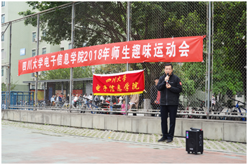冯国英院长在短暂的开幕式上致辞,并代表学院向全院师生致以亲切的问候,感谢广大师生的热情参与,希望广大师生通过本次运动会能在“双一流”建设中适时舒缓工作压力,进一步增强团结意识,并祝愿大家赛出水平、赛出乐趣。之后,电子信息学院党委邰明松书记宣布本届趣味运动会开幕。