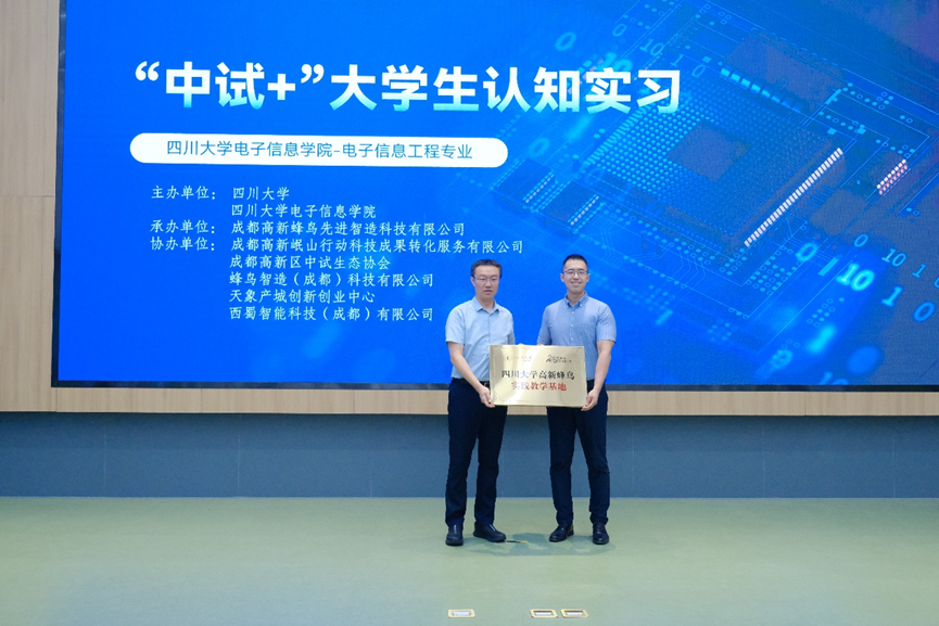 6月30日上午,best365中国官方网站高新蜂鸟实践教学基地揭牌仪式暨2025年暑期实习项目开班仪式在天象产城创新创业中心举行。电子信息学院院长杨阳、电子科学与技术系系主任李智、部分教师代表、即将参与暑期实习的电子信息工程专业学生一同参加了活动。该活动受到了公司的高度重视和热烈欢迎,成都高新蜂鸟先进智造科技有限公司董事长田勇携相关负责人出席了仪式。
