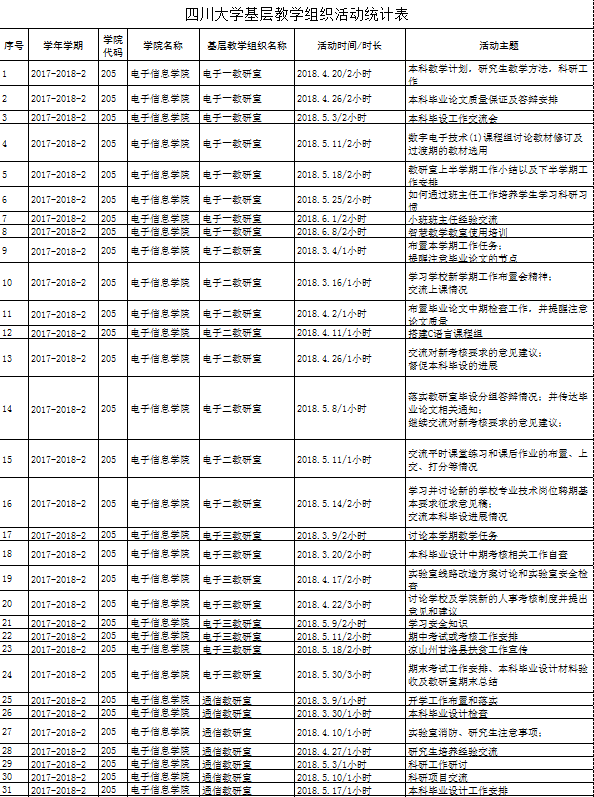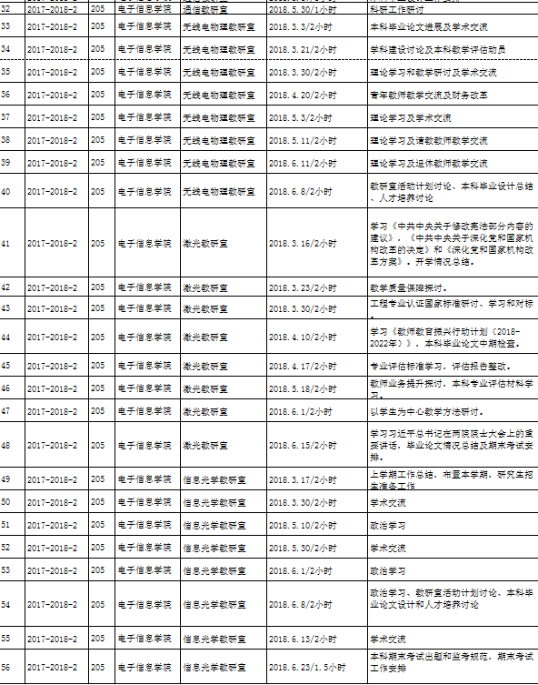 3、各系、各教研室、各课程组结合自身发展,开展形式多样的教研活动,积极进行“以学为中心”的教育教学方式方法的探索和学习,并针对学生问题开展相应的教研活动,加强教学过程管理,积极探讨课程中心建设、小班化教学改革、过程考核、非标准答案考试改革、本科论文指导、实验课程建设、学生创新实践指导,认真推动本年度教研工作,并做好相关教研活动的记录。各教研室教研活动记录不少于8次。系主任、教研室主任听课不少于4次。