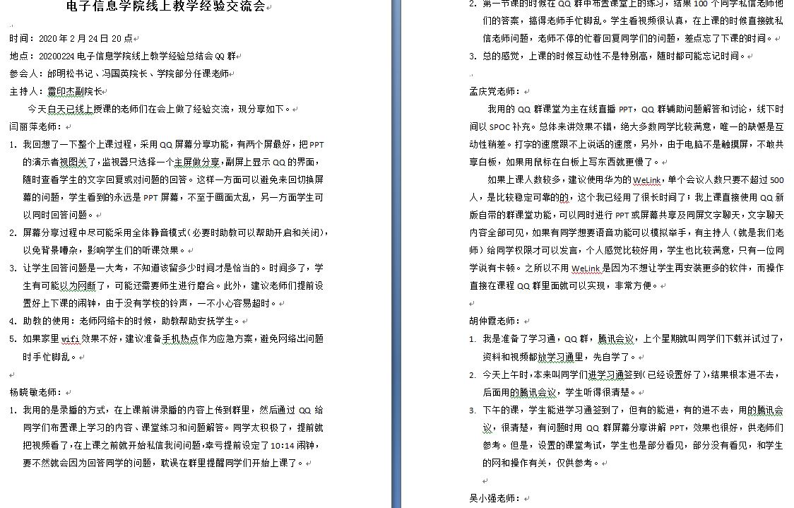 群里已上课和未开课的老师们积极交流学习,刚上完课的老师热情分享他们的线上教学经验。老师们普遍反映目前QQ、钉钉、ZOOM流畅,爱课堂、超星学习通、SPOC课的爱课程网站有卡顿现象。qq语音通话、屏幕分享方便好用。