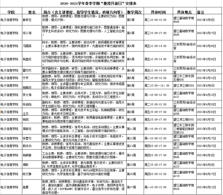 电子信息学院2020-2021学年春季学期“教授开放日”安排表
