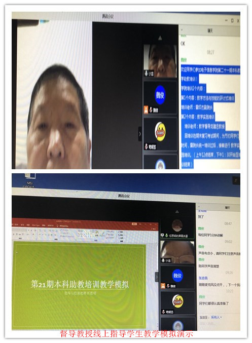 在教学实践模块培训部分,学院聘请了教学经验丰富、多次参与培训的教学督导龙建忠教授承担。在腾讯会议线上平台每位学员不限题目及形式就一个“问题”或“理论”进行5分钟的教学模拟演示,教学督导线上对学员进行点评、指导,并热情传授课堂教学经验。