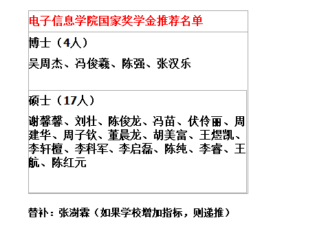 经本人申请,各专业民主评议,学院奖学金评审小组审核,现将我院2018-2019年度国家奖学金推荐名单公示如下。公示期为2019年10月10日至2019年10月13日。如有异议请于公示期内向电子信息学院奖学金评审小组提出。联系电话85463875。