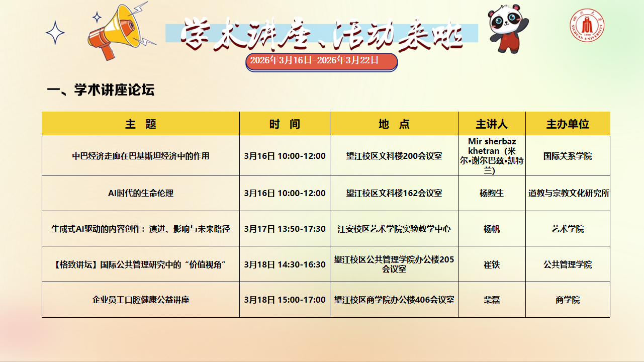 学术讲座预告(2026年3月16日-2026年3月22日)