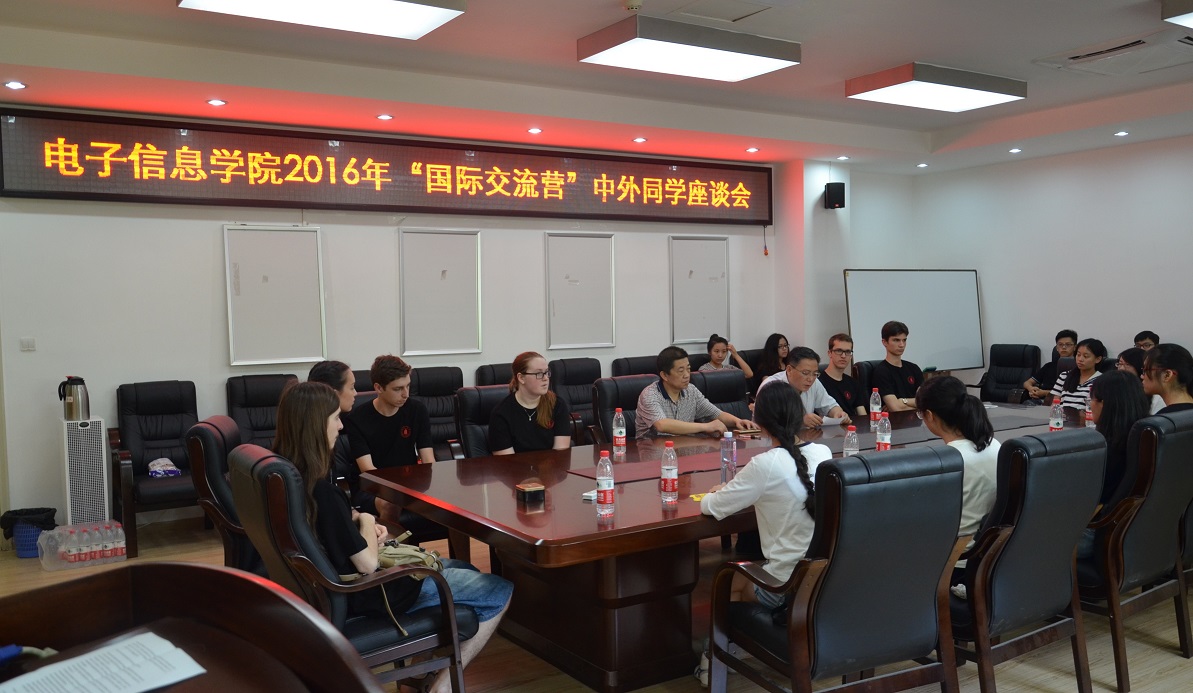 2016年7月3日下午2点,电子信息学院“国际交流营”中外同学座谈会在望江基教A303顺利举行,出席本次座谈会的有电子信息学院党委蒋斌书记、副院长周新志教授,学院院长助理杨阳老师主持本次座谈会。