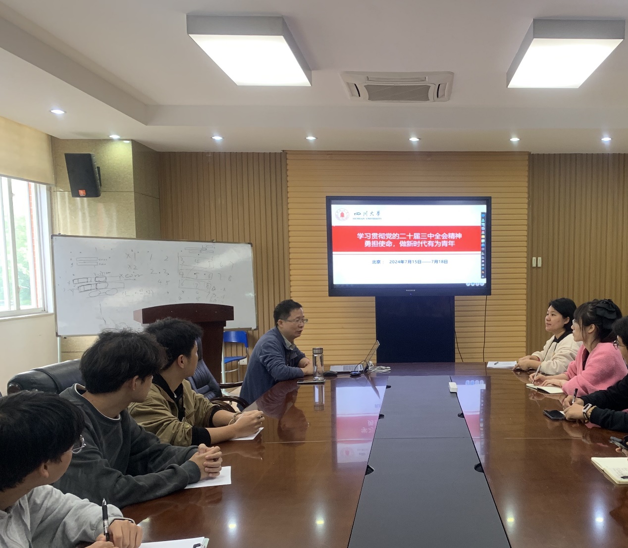 11月1日,学院党委书记彭舰在望江校区基础教学楼A303室讲授学习贯彻党的二十届三中全会精神专题党课。学院科级干部、师生党支部支委、师生党员代表等听课。