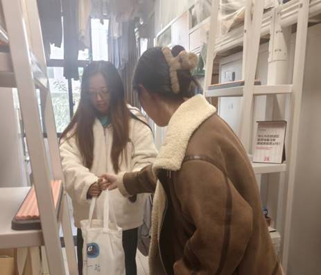 活动中,陈林老师与学生党员们走进一间间寝室,将满载着祝福的礼包亲手递到考研学子手中。礼包内不仅有实用的计时器、暖宝宝和暖心的零食,更附上了写满鼓励话语的小卡片。陈林老师还与备考同学亲切交流,细致询问他们的复习进度与生活状况,并叮嘱大家要劳逸结合,保持良好心态,以最佳状态迎接挑战。
