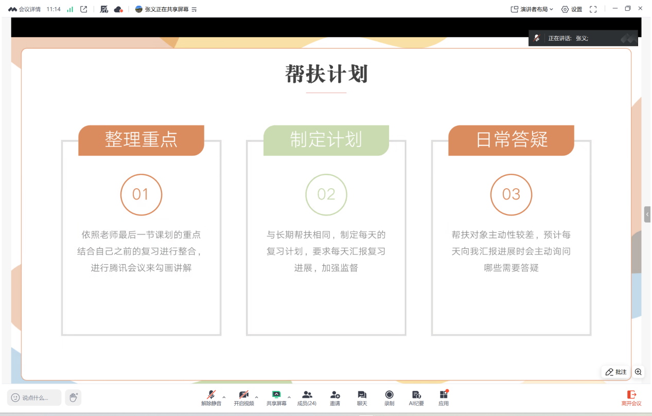 2月27日,支部线上召开考前突击指导会。本次会议聚焦补考前最后冲刺阶段,小导师们交流了前期帮扶过程中遇到的问题,分享了各自的帮扶计划,支部书记申鑫对每一位小导师的帮扶计划提出了修改意见。同时,支部实时跟进帮扶进度,督促小导师们加大监督力度,避免松懈,帮助挂科同学调整心态,以最佳状态迎接补考。