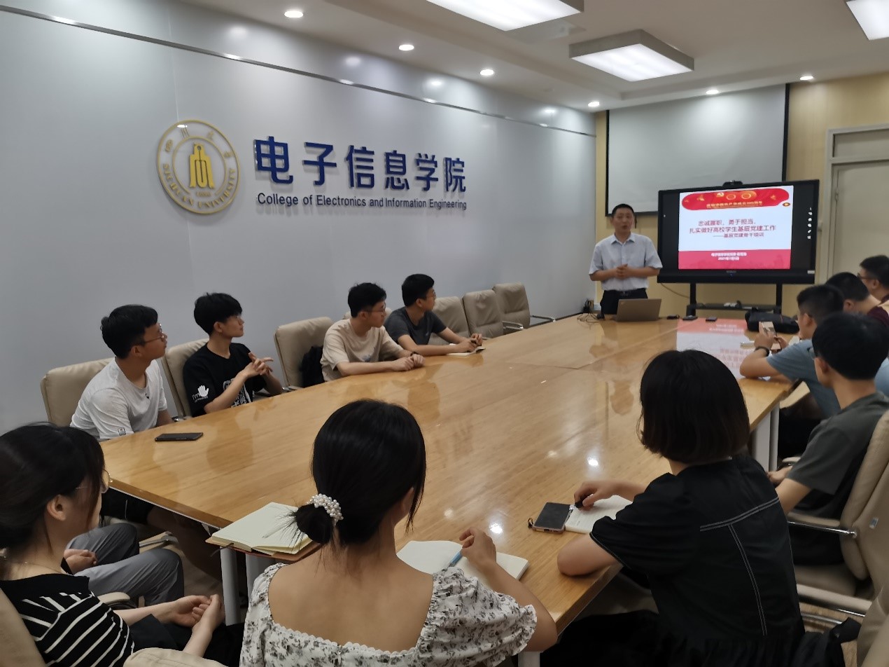 在党的百年华诞之际,为进一步加强党组织基层建设力度,严格落实《中国共产党普通高等学校基层组织工作条例》,提升学院基层党建骨干的工作能力,2021年7月5日,电子信息学院组织全体学生党支部支委在望江校区基础教学楼JA110B会议室开展了“忠诚履职,勇于担当,扎实做好高校学生基层党建工作”为主题的基层党建骨干培训。