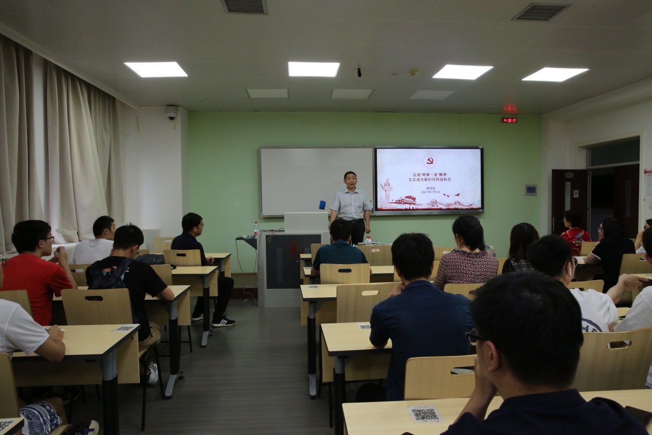 最后,邰明松强调“热爱祖国、无私奉献,自力更生、艰苦奋斗,大力协同、勇于登攀”的“两弹一星”精神正是流淌在科技工作者血液中的红色基因。科技工作者要勇于、敢于、能于攻关“卡脖子”问题、转化创新成果、践行社会责任。同学们承载着国家未来和希望,要深刻领会党史学习教育的内涵,充分发挥“两弹一星”精神,秉承“功成不必在我”的精神境界和“功成必定有我”的历史担当,和学院一起助力学校“两个伟大”的奋斗目标,为实现中华民族的伟大复兴的中国梦而努力奋斗!