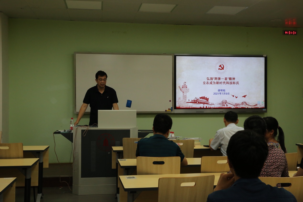 接下来,邰明松从两弹一星,扬眉吐气、两弹一星研制成功的秘诀、牢记奋进使命,登高望远立志成为新时代科技标兵三个方面进行了讲解。从中国是在怎样的核威胁阴影下,做出发展核武器战略决策、严峻形势下,中国“两弹一星” 成功之路两个方面详细解读了研制成功两弹一星,为中国扬眉吐气;从党的领导和集中力量办大事的中国社会主义体制、机制、爱国主义、集体主义、科学精神四个方面,以及邓稼先、郭永怀等先辈的事迹详细解读了两弹一星研制成功的秘诀;从全面建设社会主义现代化国家、学科跨越发展工程两个方面,结合学院有70年党龄的退休老师匡一中教授以90岁的高龄坚持在家里开展科研的感人事迹,详细解读了牢记奋进使命,登高望远立志成为新时代科技标兵这一主题的深刻含义。
