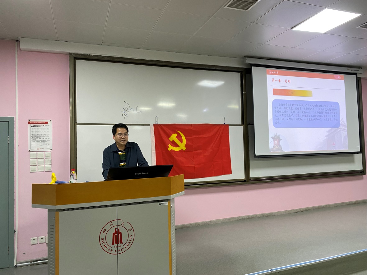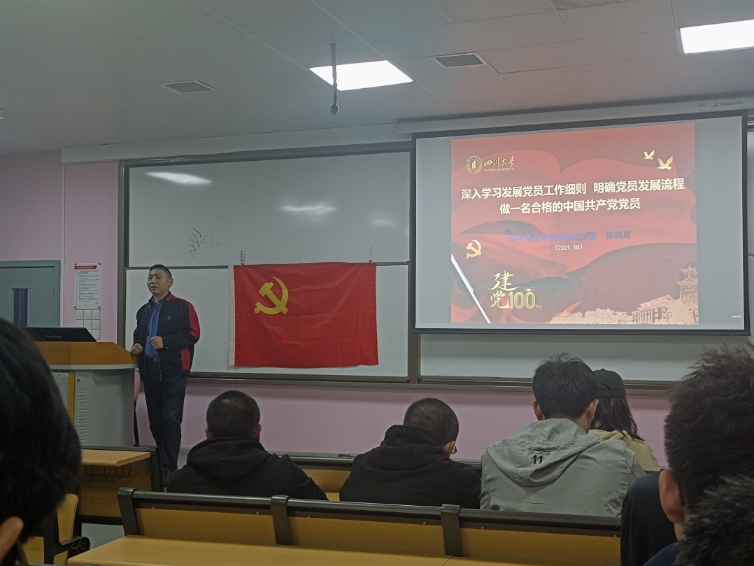 为了进一步提高学生党员质量,2021年10月19日晚在东三教336教室,学院党委针对全院新生党员和学生支部支委举办了《中国共产党发展党员工作细则》的专题培训。学院党委副书记陈笃海同志到会主持并讲话,学院专职组织员陈炳周结合中国共产党发展党员工作细则内容和新党员发展材料、新生党员档案材料中存在的问题做了题为“深入学习发展党员工作细则 明确党员发展流程 做一名合格的中国共产党党员”的培训报告。