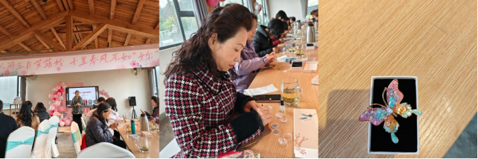 清晨,在专业老师的耐心指导下,女教师们兴致勃勃地投入到非遗螺钿发簪的制作中。螺钿镶嵌,这一古老而精妙的工艺,在女教师们的手中焕发出新的生机。大家精心挑选螺壳碎片,细心粘贴,耐心打磨,每一道工序都凝聚着匠心与智慧。制作过程中,女教师们不仅领略了传统文化的独特魅力,更在相互交流与协作中增进了彼此之间的情谊,展现了电子信息学院女教师的风采与凝聚力。