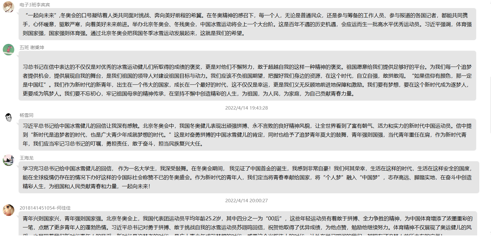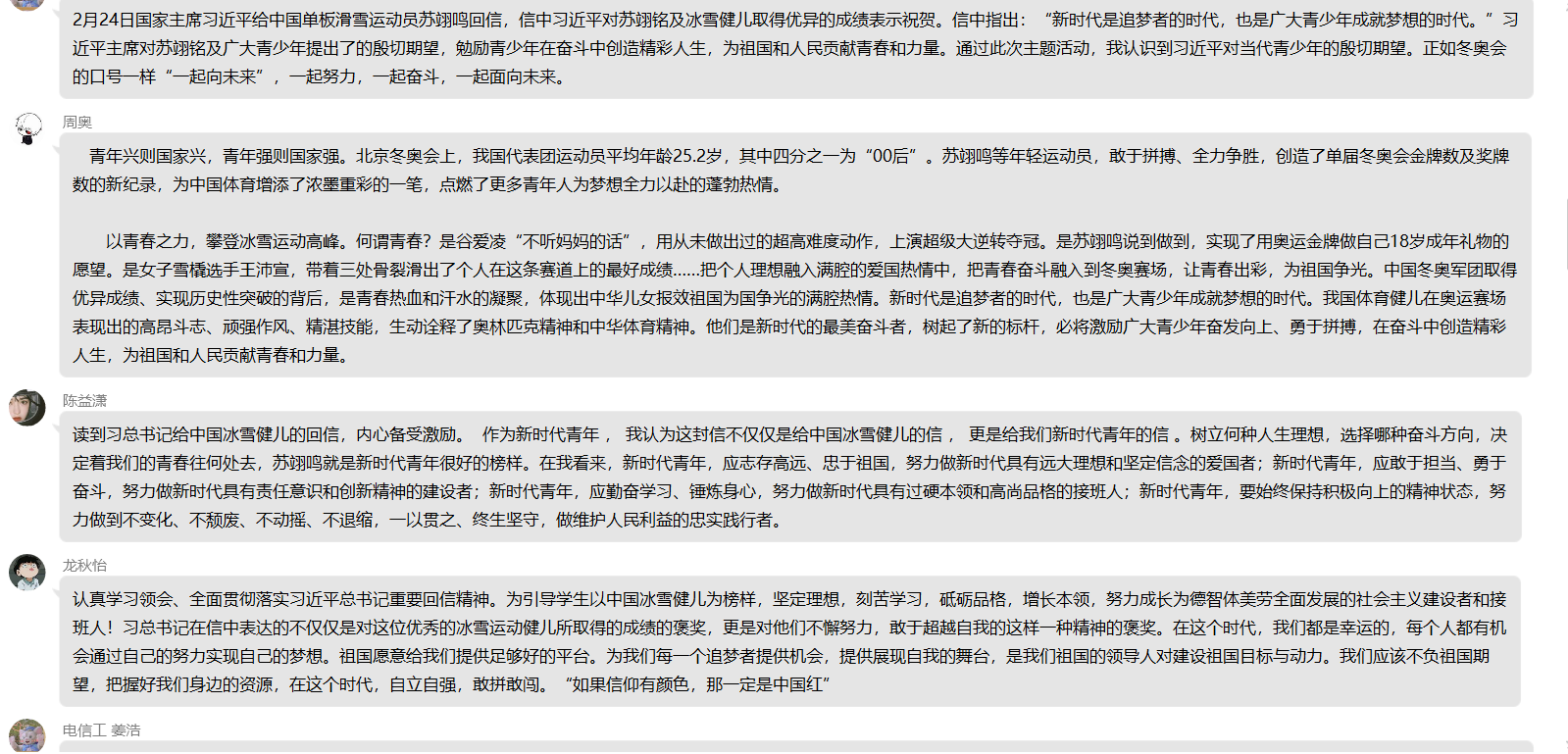 线上同学们认真学习完后,纷纷在QQ群发表了感想。作为新时代的大学生党员,冰雪健儿们不畏强手、努力拼搏的精神值得我们学习,我们也定当将青春奉献给国家,将“个人梦”融入“中国梦”,志存高远、脚踏实地,在奋斗中创造精彩人生,为祖国和人民贡献青春和力量,一起向未来!