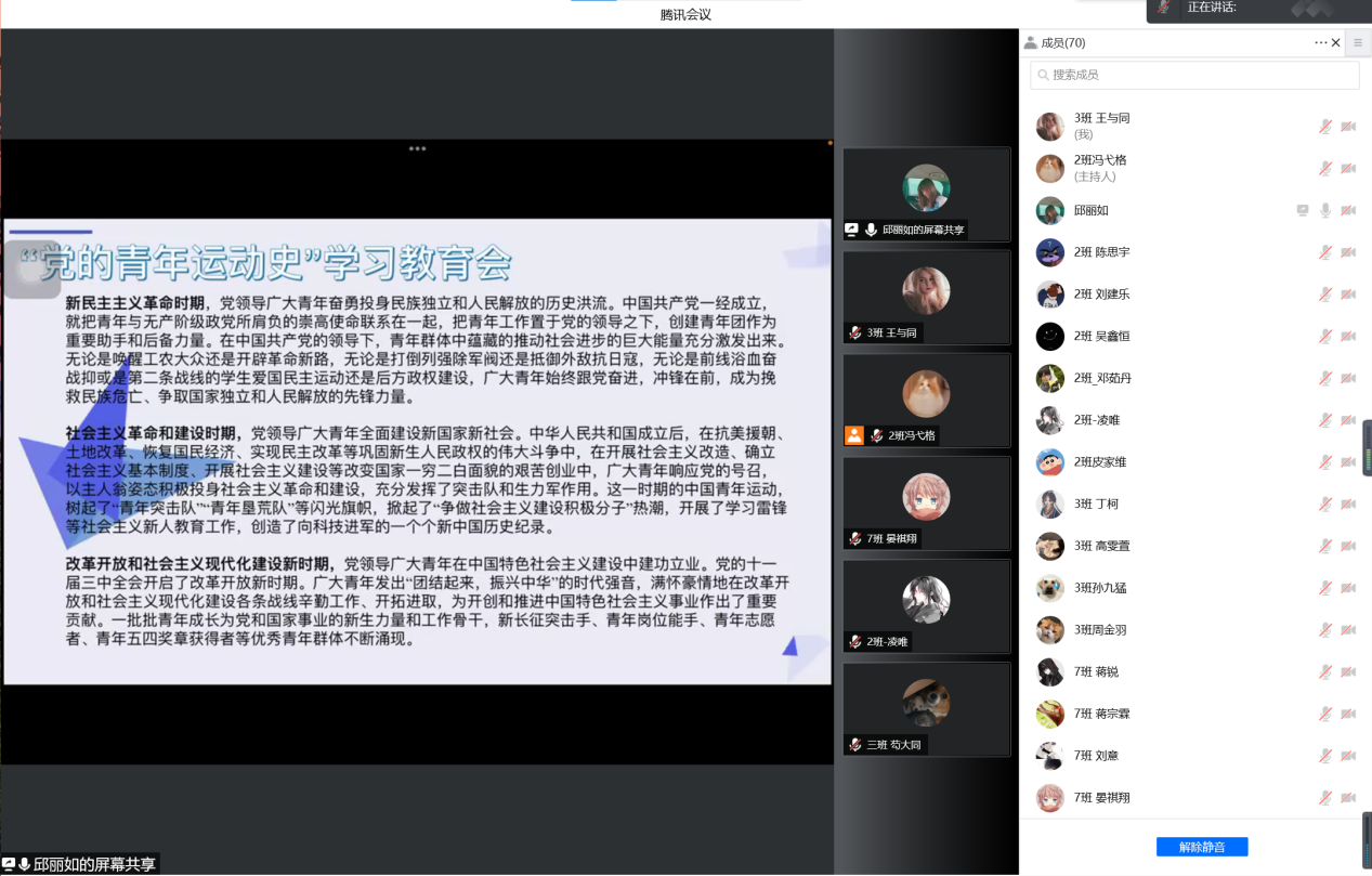 本次团日活动由7班团支书邱丽如同学主持。邱丽如同学首先用ppt的形式向同学们简单介绍了中国共产党发展历程的几个重要事件,重点介绍了这些历史事件在党的光辉历程中的重要意义和其中起领导作用的的关键人物。接下来,邱同学组织同学们观看建团100周年学习教育视频。视频不仅回顾了党的百年光辉历程,并且重点介绍了习近平总书记对新时代青年的要求和期望。视频观看结束后,同学们畅想感言。其中一位同学说到“我身边有很多人天天喊着‘反内卷,要躺平’,我承认有时候他们的话不无道理,这也是有时候学习累了之后我宽慰自己的方式。但是我认为这种口号并不应该消磨我们青年的上进心,毕竟天上不会掉馅饼,所有的成功背后必然有千百倍的努力。”活动最后,邱丽如同学组织同学们线上重温入团誓词,带领同学们回顾入团的初心。