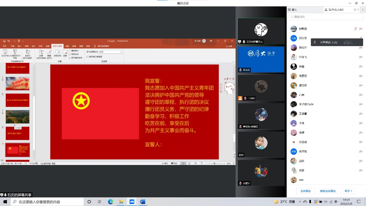 活动的最后,全体团员在主持人的带领下重温入团誓词,再次宣誓,警醒自己不忘初心,砥砺前行。随后,全体团员有序签退并退出会议,本次团日活动至此圆满结束。