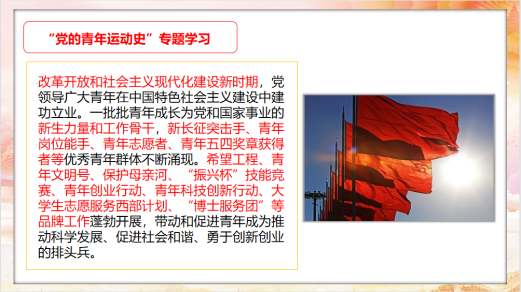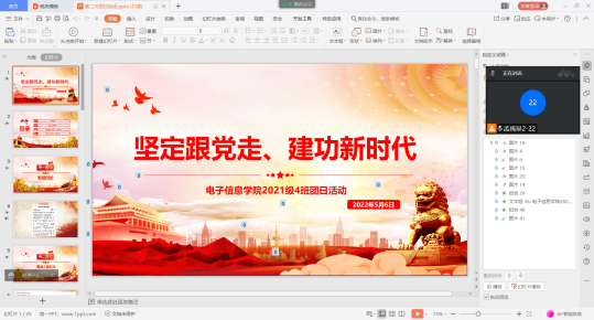 2022年5月6日19点30分,电子信息学院本科2021级4班于线上开展团日活动。本次团日活动以“坚定跟党走,建功新时代”为主题,聚焦于中国共青团成立100周年这个时间节点。