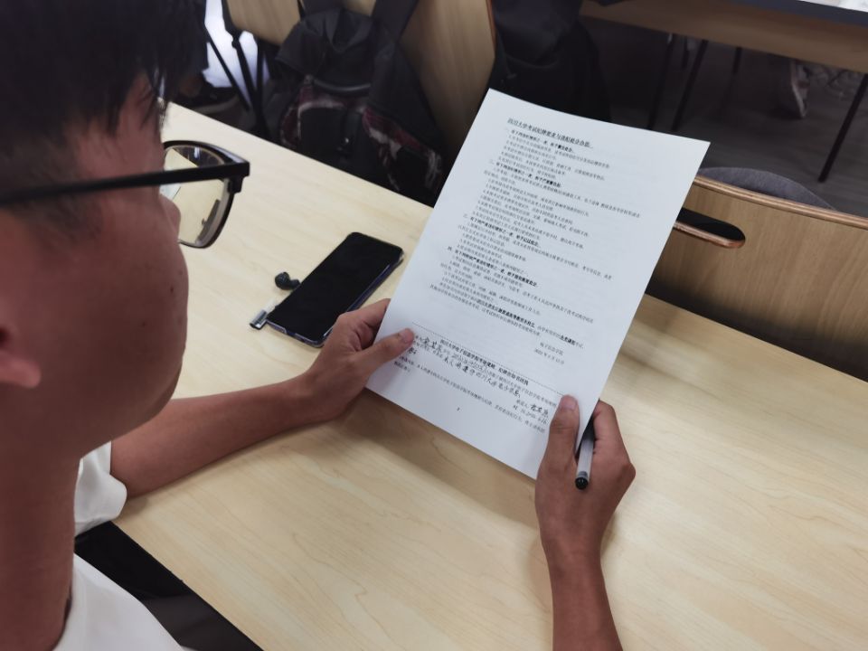 会议上,陈晓娟老师着重强调了遵守考试纪律的重要性。她指出学校及学院高度重视同学们的考试诚信问题,并结合往年考试时学生违纪舞弊被严肃处理的事例,提醒同学们要以诚实守信为荣,以考试违纪为耻。她还提醒同学们注意考场的相关规定细则,切记不要因为大意疏忽而违反了考场纪律。随后为同学们分发了考试纪律承诺表。同学们详细阅读了考试相关纪律,并郑重承诺遵守纪律,签完名后纷纷上交。