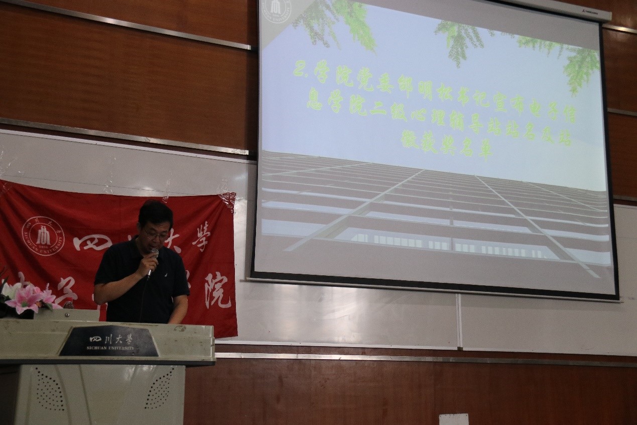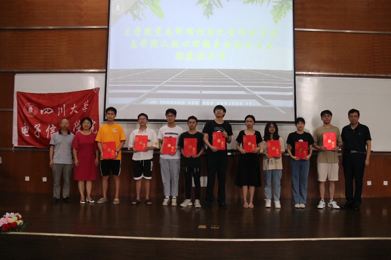首先,学院党委邰明松书记宣布电子信息学院心理辅导站站名及站徽征集活动的九组获奖名单。然后,王英梅主任、邰明松书记、廖勇明副书记为九组获奖同学颁奖,并祝贺获奖同学。