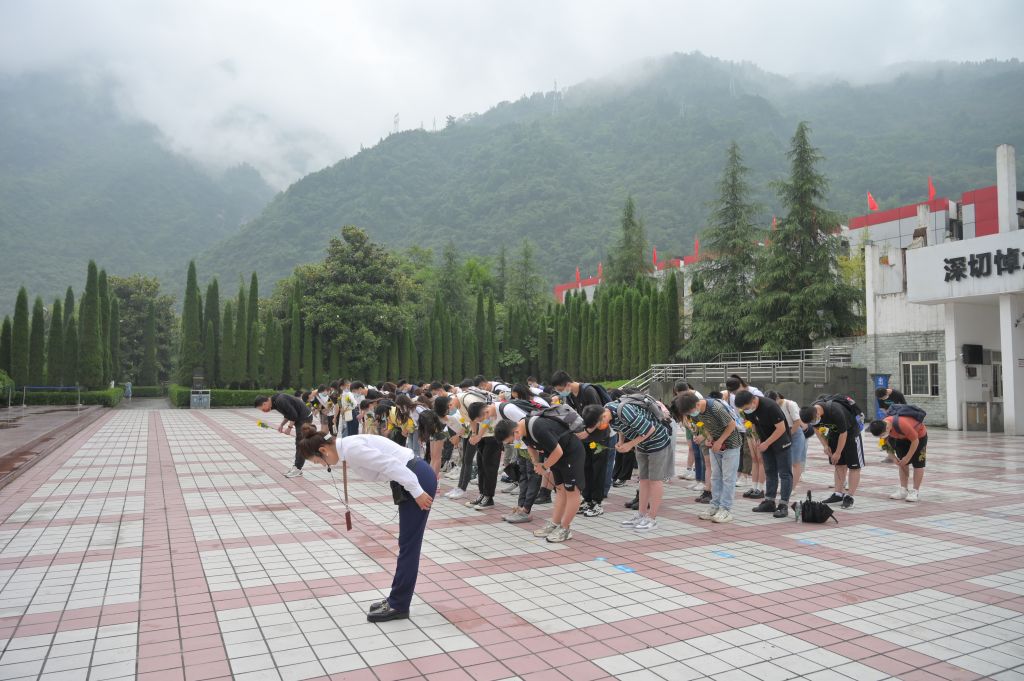 首先,党员们在讲解员的带领下来到了四川汶川特大地震漩口中学遗址。党员们手捧鲜花排成数列,默哀致敬,并依次上前献花。献花完毕,跟随讲解员去中学参观学习,讲解员结合自身亲历的感受,全程详细地讲述着这座中学,党员们都被眼前倾斜的教学楼、宿舍楼所震撼,仿佛重回当时那令人悲痛的时刻。讲解员眼含热泪的讲解,也让我们了解到漩口中学下面至今还有未被挖掘的学生遗体以及这所中学里面曾经守护着也将永远守护着这所学校的英雄老师。