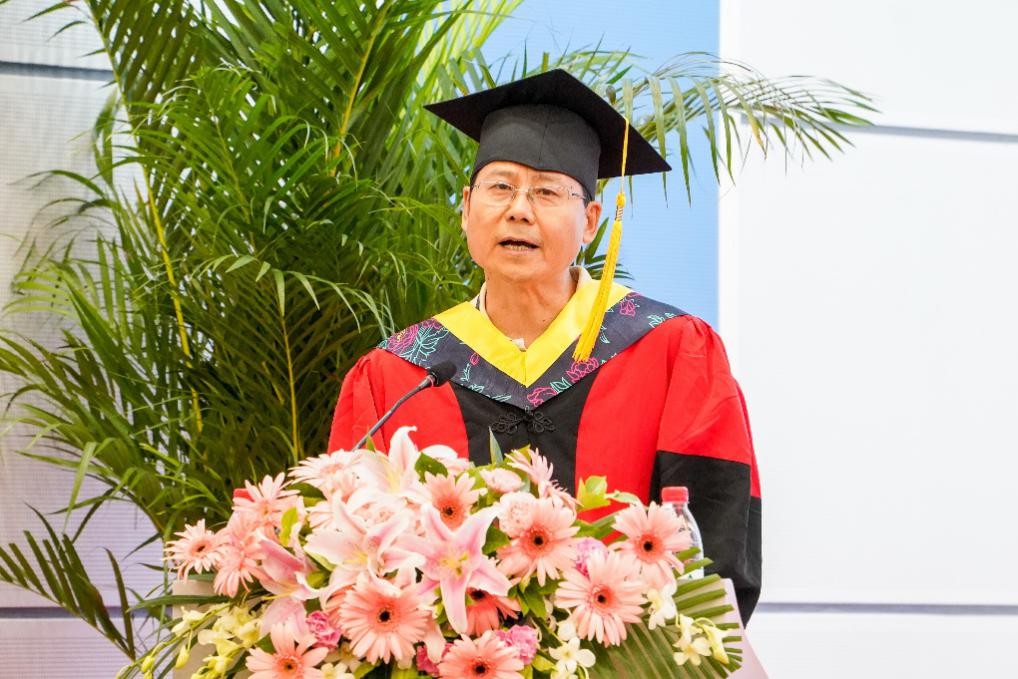 教师代表郭庆功教授向同学们表示热烈的祝贺,他告诫同学们“帽子”固然重要,但本领和素养才是终身的法宝。郭庆功教授希望同学们要学会感恩,要有责任担当;要提高阅读和思考的能力,要学会“低头拉车、抬头看路”。他期望同学们在未来的岁月里心中有理想,脚下有方向,眼中有光芒,肩上有担当。
