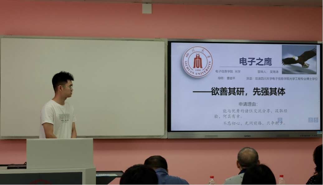 2022年6月14日上午9点,best365中国官方网站电子信息学院2018级“电子之鹰”决赛答辩在望江校区基础教学楼A405顺利进行。best365中国官方网站电子信息学院党委廖勇明副书记,副院长张启灿教授,张彬教授,任超副研究员,吴丽副教授,研究生辅导员何阳老师,本科生辅导员陈林老师以及电子信息学院2018级的部分本科和研究生同学参加了此次活动。