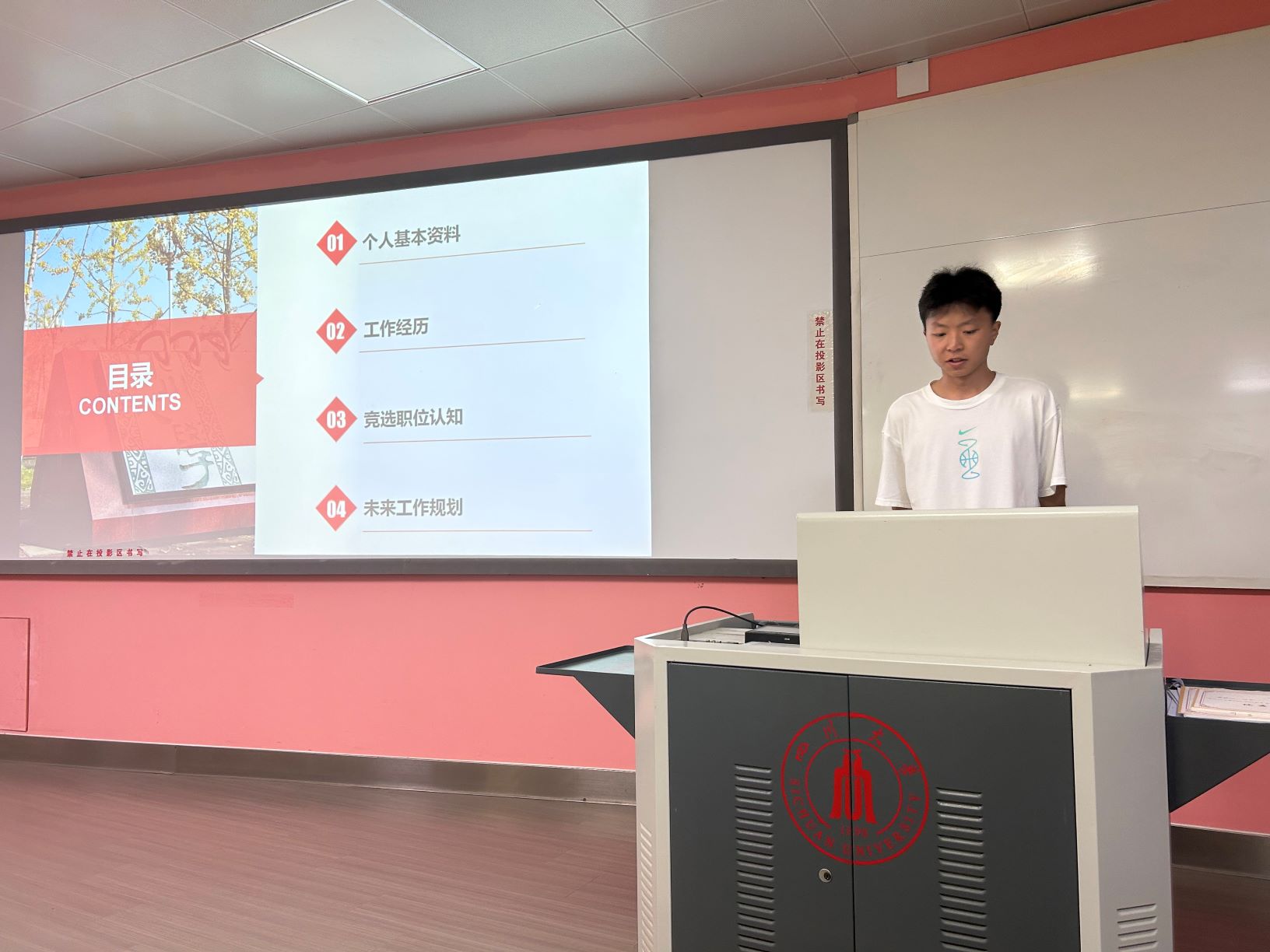 本次干部竞选大会由现任宣传媒体中心部长蔡睿同学主持,大会首先进行的是2022-2023学年工作总结。现任主席郭俊峰同学汇报了研分会过去一年的工作内容,并总结了不足之处,同时也表达了对研分会成员工作的认可,对学院领导、指导老师和支持研分会工作的所有同学表示了由衷的感谢。本次竞选大会实行严格的不记名投票,保证了竞选的公正公平。