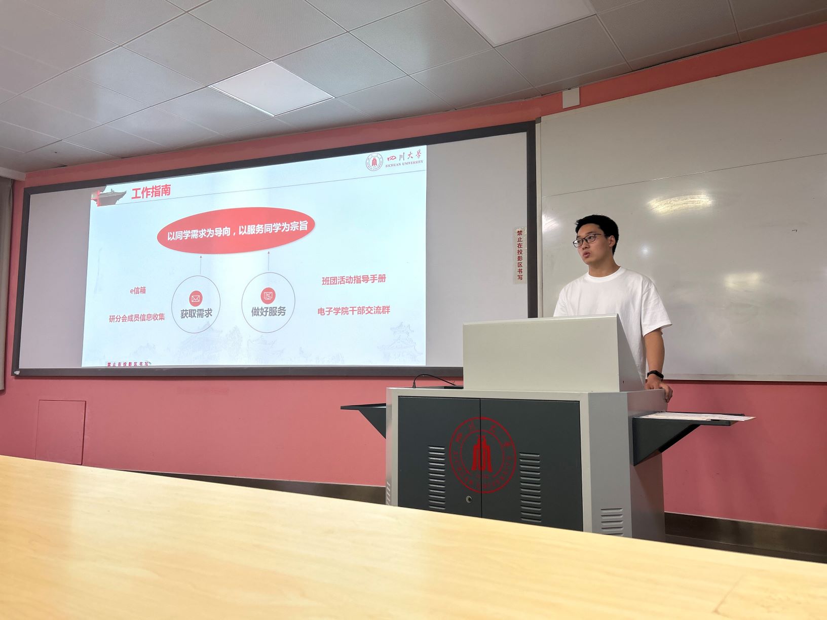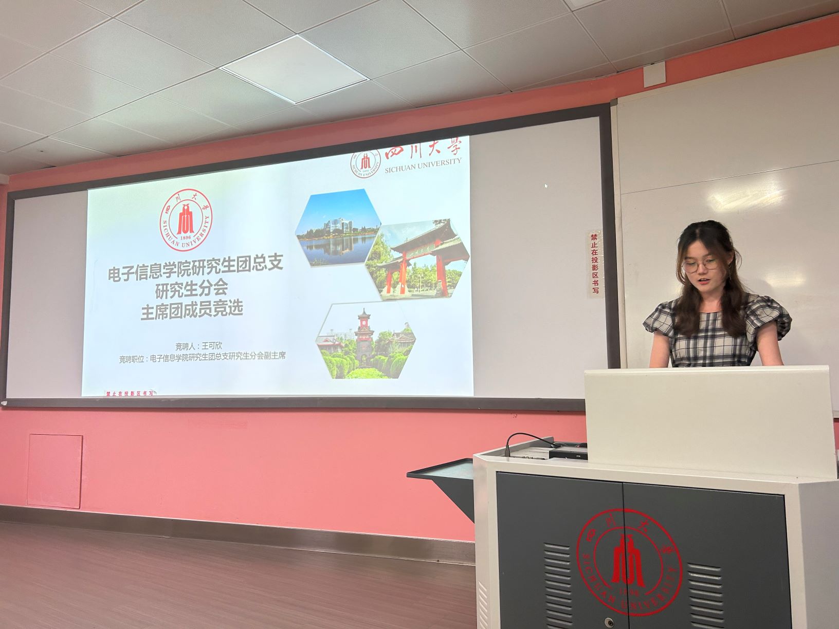 2023年6月29日晚上19:00,电子信息学院研究生团总支研究生分会2023-2024学年干部竞选及换届大会在望江校区基础教学楼A座404教室顺利召开。出席本次会议的嘉宾有电子信息学院党委副书记廖勇明,电子信息学院分团委副书记、研究生分会指导教师何阳。参加本次大会的还有电子信息学院研究生分会干事,2021级、2022级研究生班团干部和SPIE协会成员。