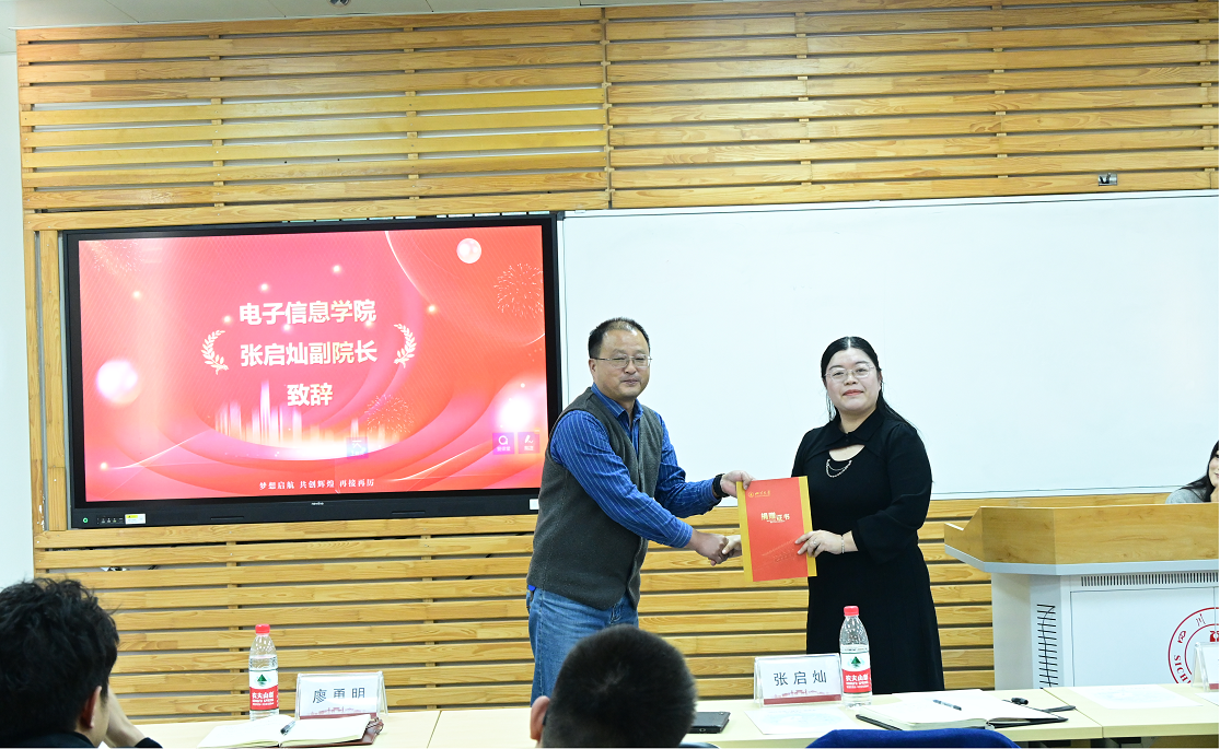 2023年11月22日下午2点20分,电子信息学院“舜宇”奖学金颁奖典礼在望江校区基础教学楼A座308教室顺利举办。此次颁奖典礼由电子信息学院党委副书记廖勇明主持,舜宇集团有限公司人力资源部部长姜淑飘女士、舜宇集团有限公司校园招聘经理孙佳阳先生、电子信息学院副院长张启灿教授出席颁奖典礼。参加本次活动的还有电子信息学院学生科长谢明老师,团委副书记何阳老师,学院研分会成员,所有获奖同学,2022级、2023级硕士研究生代表。