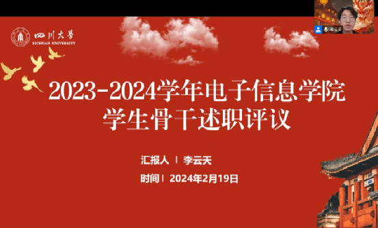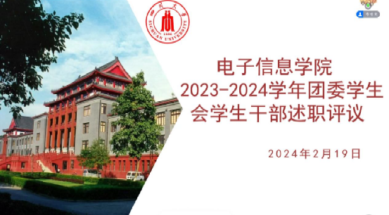 2024年2月19日9:30,电子信息学院团委学生会23-24学年秋季学期学生干部述职评议于线上顺利举行。本次述职评议大会旨在让团委学生会干部对23-24学年秋季学期期间工作的情况、心得体会、存在的问题进行总结汇报和反思,并为新学期更好地开展新的工作做好准备。
