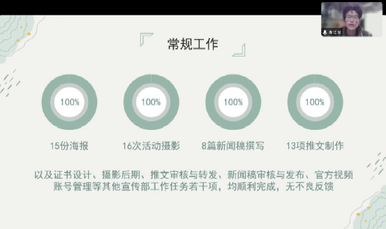 接着,由部长团对各部门秋季学期的工作情况进行总结。组织部部长王上飞、权益素拓部部长谢金均、宣传部部长廖江洪、文艺部部长涂彧、创就业与外联中心部长谷欣瞳、体育部部长王佳、学科部部长张博涵、办公室部长许天昊、青年志愿服务队队长尹豪宇依次对上一个学期的部门工作情况、思考与不足、未来畅想进行了发言与总结。部长团的发言旨在能够更好地开展新学期的工作、同时也为换届的顺利进行奠定了基础。