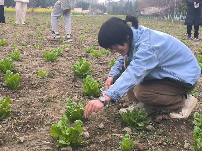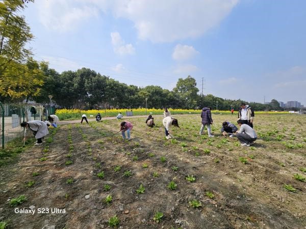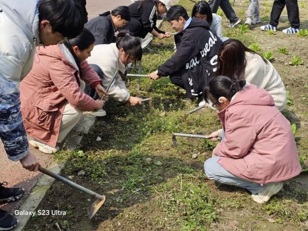 第一天,同学们分成几个小组,有序领取手套、铁锹等农具。初春的暖阳下,大家三五成群,撸起衣袖,相互配合,在满是石头杂草的作物间弯腰劳作。阳光洒在耕地间,仿佛是大地母亲的温情抚摸;此起彼伏的劳动声,仿佛是春天里的乐章,每一根拔出的杂草,都是对作物的尊重和爱护;每一声欢笑,都是对劳动的热爱和投入。在这一片绿意中,他们似乎找到了自己的位置,与自然融为一体,奏响着和谐的生命交响曲。