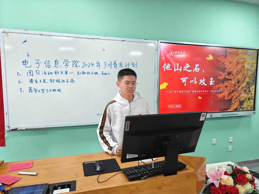 2024年3月24日上午10时,院团委组织部于江安校区综合楼B104教室举行三月青禾计划活动。本次活动旨在提高团干部思想理论水平和政治素质,培养团支书的时代责任感和担当精神,发挥团支书的标杆和引领作用,本科2023级团支书参会。