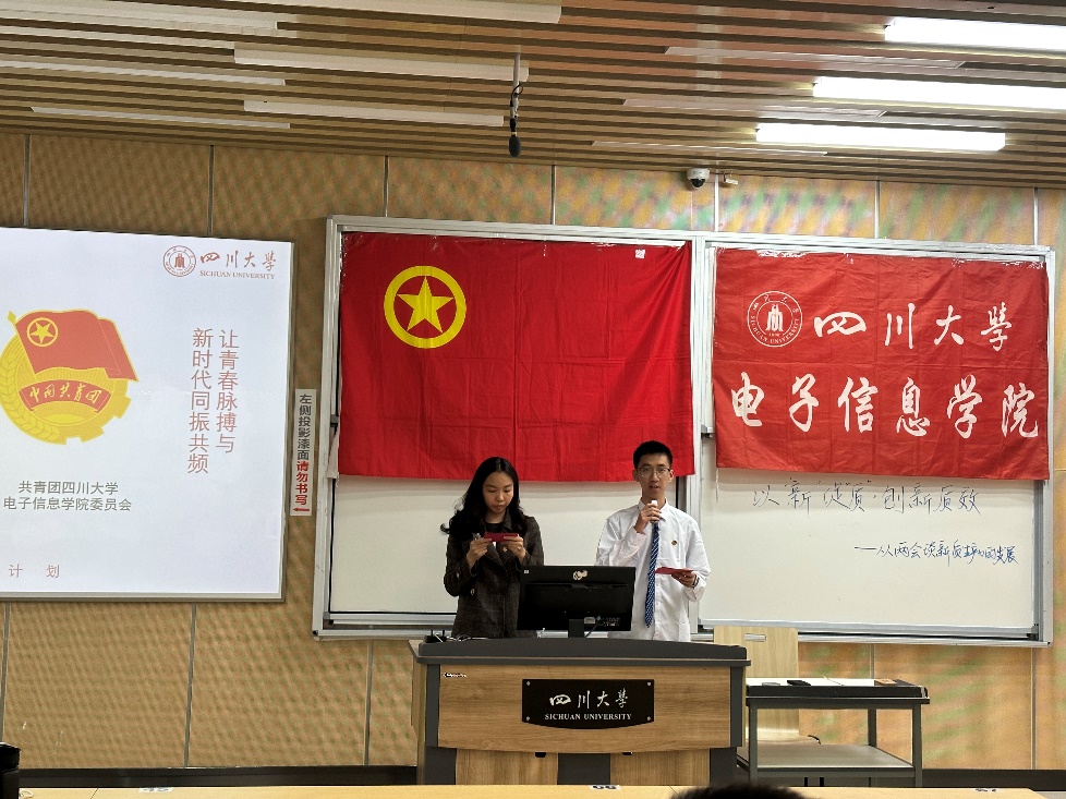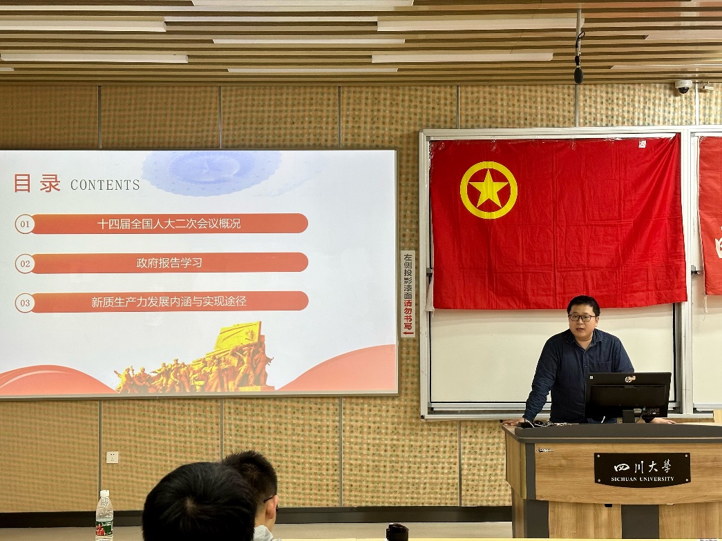 为深入学习贯彻全国两会精神,提升同学们对于时代发展动向的把握,培养创新思维和创新能力,3月29日晚上,由院团委主办的“以新促质,创新质效——从两会谈新质生产力发展”主题团课于best365中国官方网站江安校区综合楼C203顺利举行。本次主题团课由best365中国官方网站青年讲师团成员、院团委副书记申鑫老师主讲,部分团学干部、学生代表参加。