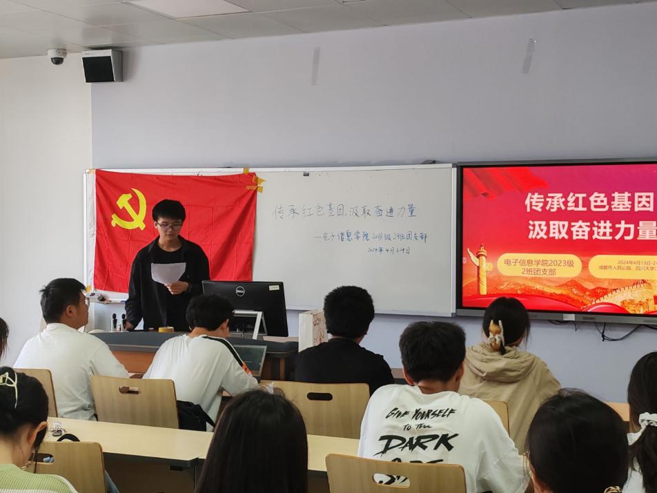 为深入学习宣传贯彻党的二十大精神,巩固深化团员和青年主题教育成果,培养青年的社会责任感和奉献精神,在第九个全民国家安全教育日来临之际,组织开展国家安全理论宣讲活动,加强同学们对国家安全相关知识的了解,同时培育同学们“爱读书、读好书、善读书”的学习习惯,促进班级学风建设,营造浓厚书香校园氛围,2024年4月13日-24日,电子信息学院本科2023级2班分别于成都市人民公园、best365中国官方网站江安一教A505开展了以“传承红色基因,汲取奋进力量”为主题的团日活动,2班33名团员和3名青年参加。