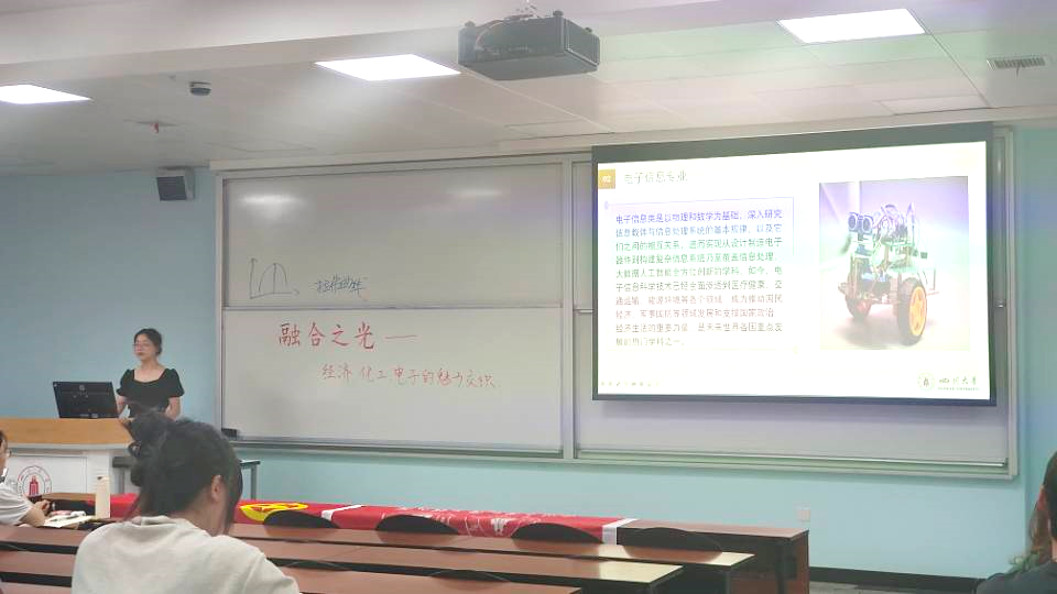在本次团日活动的第二部分,电子信息学院学生代表谭晶晶结合PPT内容,向在座化学工程学院同学和经济学院同学详细介绍了电子信息学院,并就电子信息工程、通信工程、光电信息科学与工程三个分流专业讲述了其专业联系与差别以及各方向的就业前景。讲解结束后,谭晶晶同学组织在座同学讨论了自己对电子信息专业的看法以及其他专业在电子信息专业内的应用。胡源小卷同学就电子信息专业在生活中的应用发表了深刻见解。