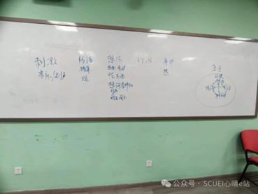 接下来是冥想,在这一部分,何惠老师引导大家,在两段不同的音乐中从头到脚不断放松自己,并且希望通过两段不同音乐,帮助大家觉察情绪变化。第一段音乐是急促的鼓点,第二段音乐又转而舒缓,不同的音乐会带给人不一样的感受,同学们可以在聆听音乐这一过程中,捕捉自己情绪的变化。冥想结束后,同学们都描述了在这个过程中自己所感所想。a:本来工作很烦躁,但是突然平静下来。b:想到吃饭,然后写作业,安排规划,平静。先是音乐烦躁,然后音乐平静了,心理杂念万千,有五一规划。然后开始对自我思绪的觉察。开始紧张烦躁,之后平静。c:刚开始鼓点让人很烦躁,打断思绪,感觉不舒服。逐渐听了何老师的引导,开始放松,有关门声打断放松声音,之后平静了,一会儿身体发热。没有觉察到音乐区别,只关注到了自己的感受以及热。风声在吹,又调整回来。d: 没区别出两段音乐。水滴起水花。很平缓。e:第一段音乐好像不存在,很平静,根据引导词,有了一定未来规划安排。第二段音乐河里仰躺。f:先是音乐烦躁,然后音乐平静了,心理杂念万千,有五一规划。然后开始对自我思绪的觉察。开始紧张烦躁,之后平静。g:第一段音乐感觉比较烦躁,想起建筑工,没有注意到音乐切换。最后快结束的时候,又想起害怕外界刺激,没能全身心投入。没能注意到音乐切换,以为是寺庙转换,想到明天周六。