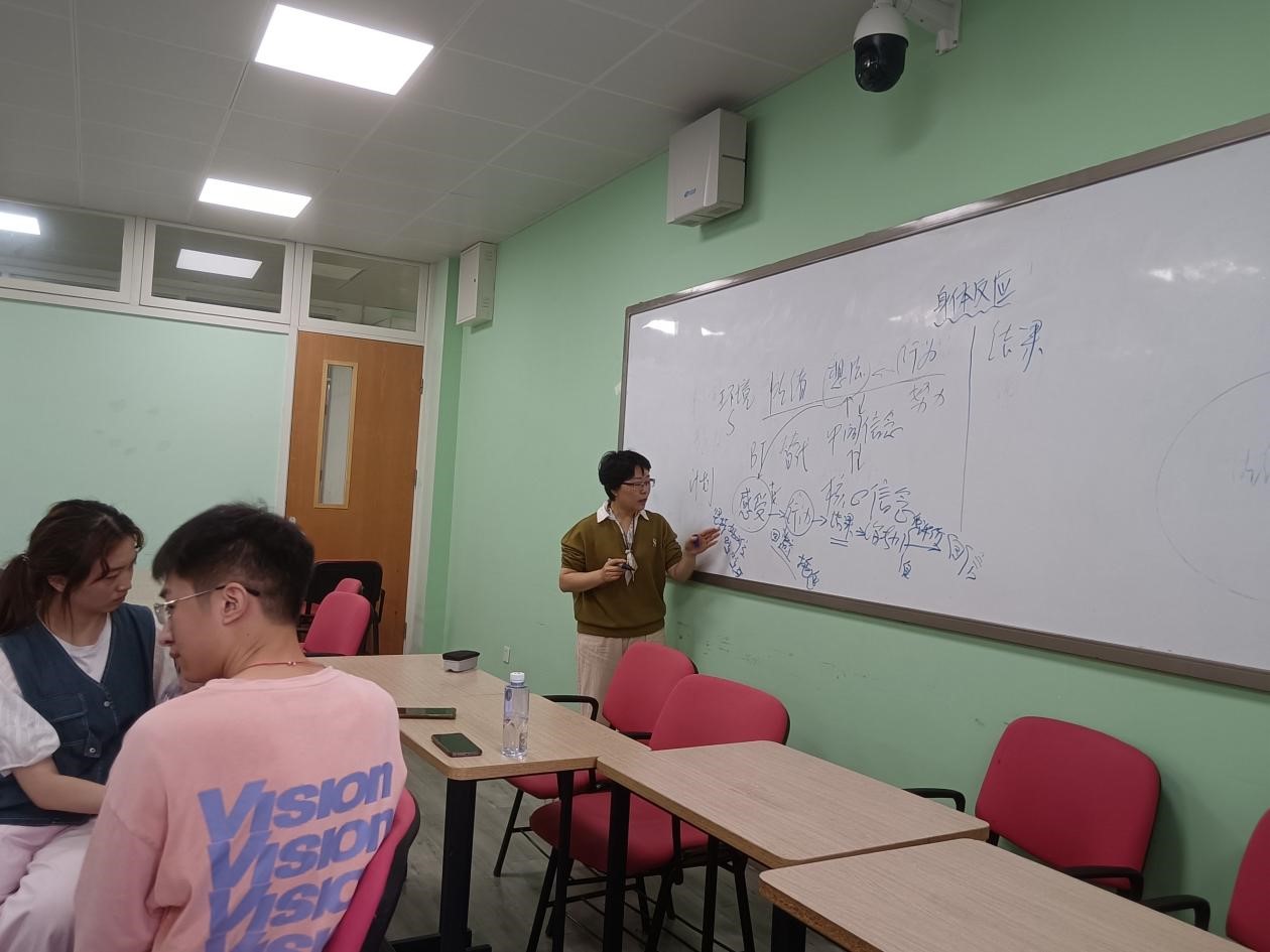自我介绍后,为了加深同学们彼此之间的印象,何老师让同学们按方向说出坐在自己右侧同学和老师的主要信息(包括姓名、爱好和所在学院等)。在这一过程中,同学们和老师对彼此有了更为深刻的了解。通过对前面的同学和老师的个人信息的简单记忆,大家快速认识了彼此。此外,这也是老师了解同学们近期心理状况的契机,为后续的心理学理论的引入作铺垫。