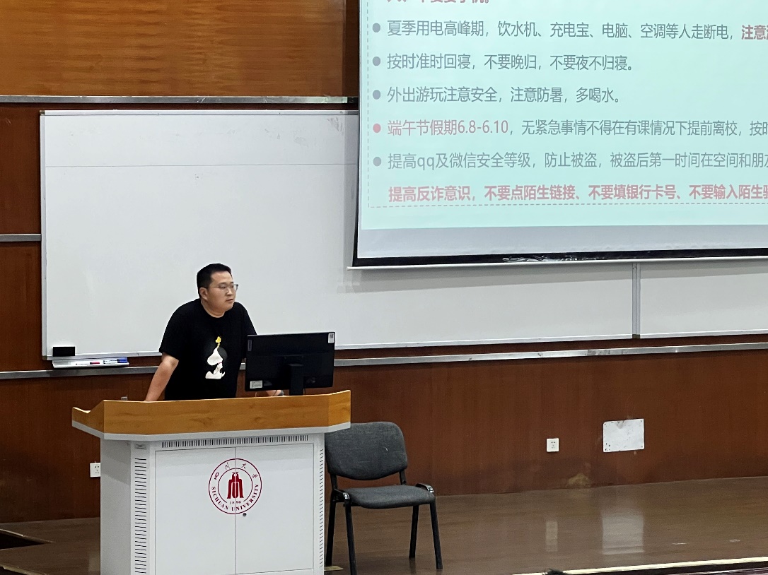 大会首先聚焦于安全教育及电信诈骗防范。申鑫老师强调了新修订的《成都市非机动车管理条例》的重要性,提醒同学们在出行时要注意安全,遵守交通规则,如靠右行驶、不醉酒驾驶、礼让行人等。同时,针对夏季用电高峰期,他提醒同学们注意消防安全,人走断电,确保用电安全。此外,老师还特别强调了外出游玩时的安全注意事项。