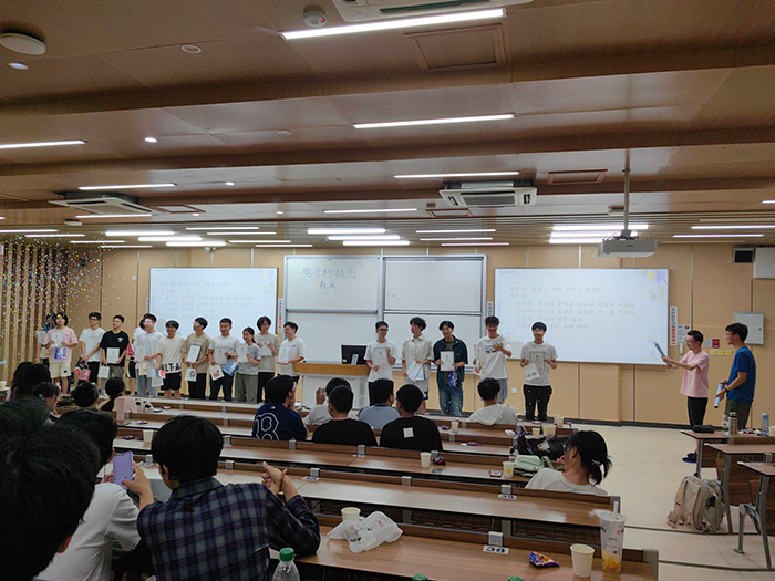 本次社庆活动设计了多种多样的趣味游戏和精彩绝伦的表演节目。同时,社庆策划人员还为大家准备了许多小零食,让大家在开心玩游戏、看节目之余也能品尝到美味的零食。为了增加游戏的趣味性和参与人员的积极性,这次活动还设置了奖券抽奖环节。首先进行的游戏是反向指挥,既考验参与同学的反应力和随机应变能力,又赢得了台下观众的笑声。接着是两位同学带来的《夏天的风》吉他弹唱,在娓娓动听的歌声中,让同学们感受到了浓浓的夏日氛围。之后进行了“谁是卧底”、“传声筒”、“加字游戏”等一系列有趣的互动游戏,同学们也带来了各自精心准备的《任我行》《江南》歌曲表演、《极乐净土》舞蹈表演等节目。在一阵阵欢声笑语中,本次社庆来到了最后的聘书环节,屏幕上展示了科技园同学们为学长学姐准备的留言,同时工作人员也为各位学长学姐准备了礼物与聘书,感谢他们在这一年中为科技园的辛苦付出与默默奉献。在大家热烈的掌声中,电子科技园社庆正式结束。