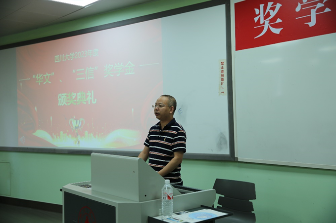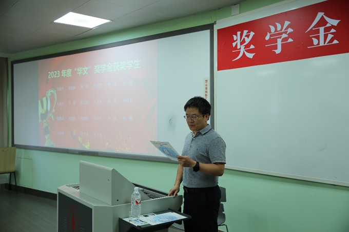 首先全体师生起立合唱中华人民共和国国歌。随后廖勇明副书记介绍了到场嘉宾及领导、卿粼波副院长宣读2023年度“华文”奖学金获奖名单。然后获奖学生代表寇廷栋同学发表获奖感言。寇廷栋同学表示非常荣幸能够获奖,感谢学院的培养和认可。获奖是他对未来充满了信心和动力,将继续努力学习并不断提升自己的专业技能,不断提高自身综合素质和能力,回报母校、回报社会。
