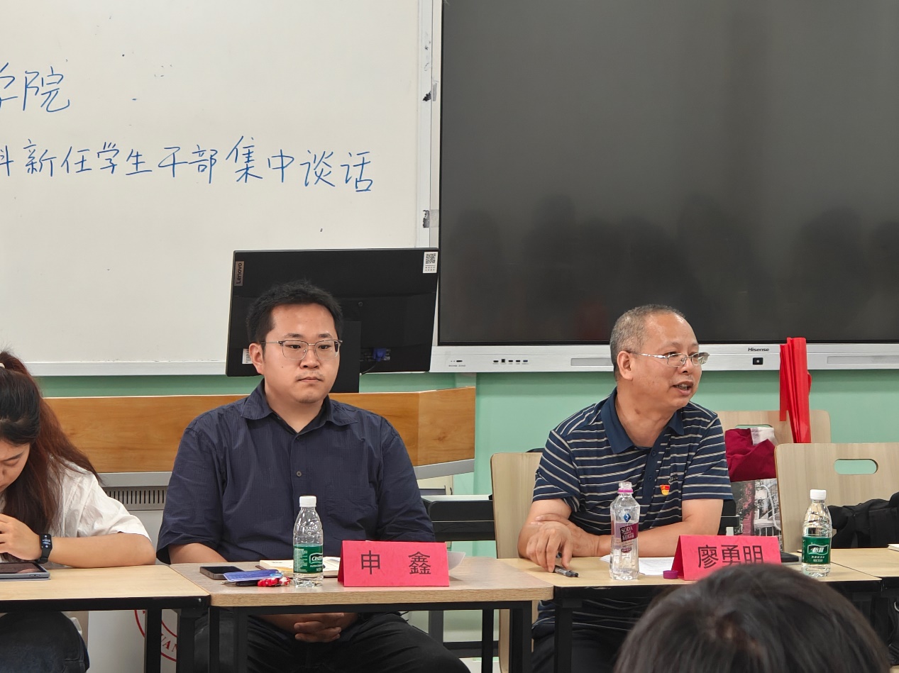 首先由廖勇明副书记代表学院党委讲话,谈话内容提纲挈领、详实贯通,提出学生干部要认清身份角色、找准学生干部定位、主动寻求能力培养机会三个要点。作为学生干部要爱党爱国、敬业友善,提升自身的综合素养,包括表达交流、情绪管理、时间规划在内的多重能力。接着由申鑫老师代表学院团委进行谈话,对学生干部提出严守纪律、尊师重道等要求,并通过分享自己担任学生干部的经历,勉励新任学生干部要“敢干、敢创、敢冲”,发扬吃苦耐劳,奋勇争先的精神。